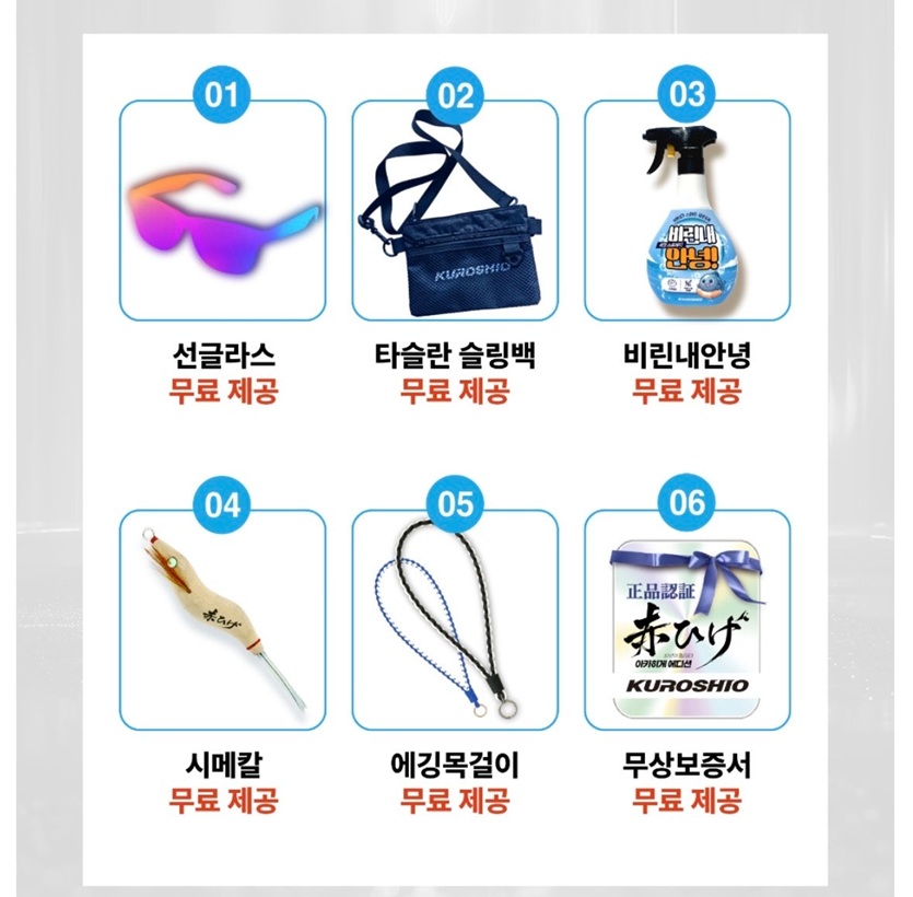 사은품이 더 탐나는 이벤트로 인하여 쿠로시오 무늬오징어 낚시대(에깅로드) 82ML 새롭게 영입했습니다. 그 동안 일본산 하이엔드급 에깅로드만 테스트 하다가 더 이상 테스트 해 볼 조구사들이 없어서 이젠 국내 조구사들의 에깅로드 재질과 성능이 많이 향상된 듯 하고, 그 가격 또한 엄청나게 저렴하기 때문에 어느 정도의 성능을 보여주는 지를 테스트 해보기 위해서 이벤트 기간에 주문을 완료하였고, 2026년 2월 4일에 일괄 택배발송 해주어 2월 5일 목요일에 택배 수령했습니다.(있는 곳은? 제주시 입니다)일단 사은품을 먼저 확인하도록 하지요.1.선글라스2.타슬란 슬링백3.비린내 제거제4.시메칼5.에깅목걸이6.무상보증서위 6종의 사은품이 함께 동봉되어 에깅로드와 함께 받았습니다.에깅로드는 육안으로 봐서는 알 수..
