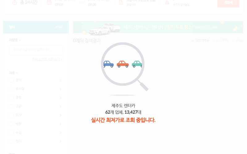 제주도 렌터카 검색하시면, 62개 렌터카 업체의