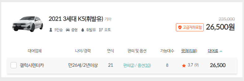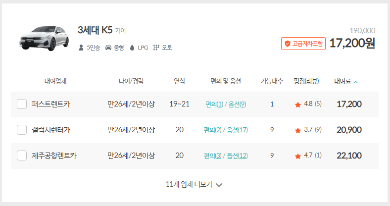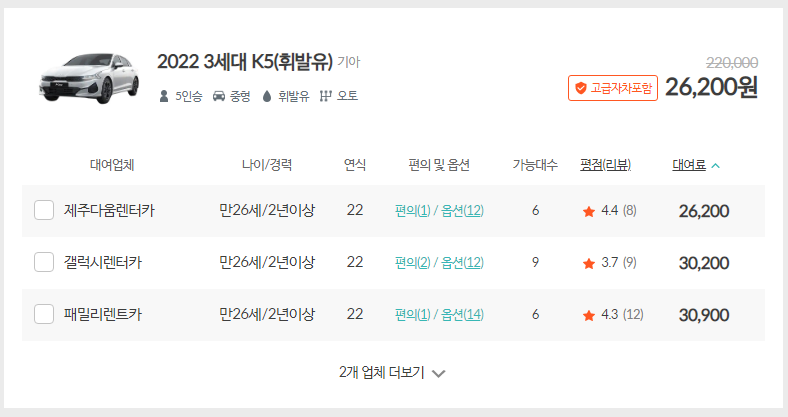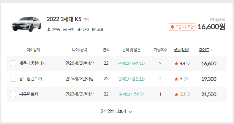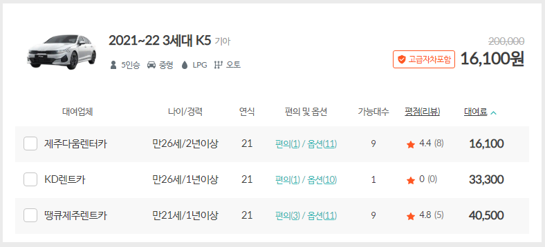 ※ 제주도 렌터카 3세대 K5 차량 검색한 후, 가격순으로 나열시켜봤습니다. ※