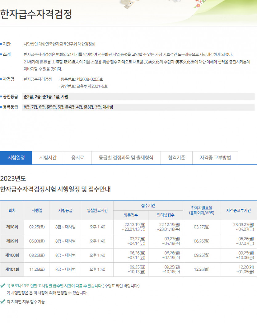 2023 대한검정회 한자급수시험 원서접수 일정 및 한자시험일정 확인하고, 한자 인터넷강의 수강하고 시험공부 시작하여,