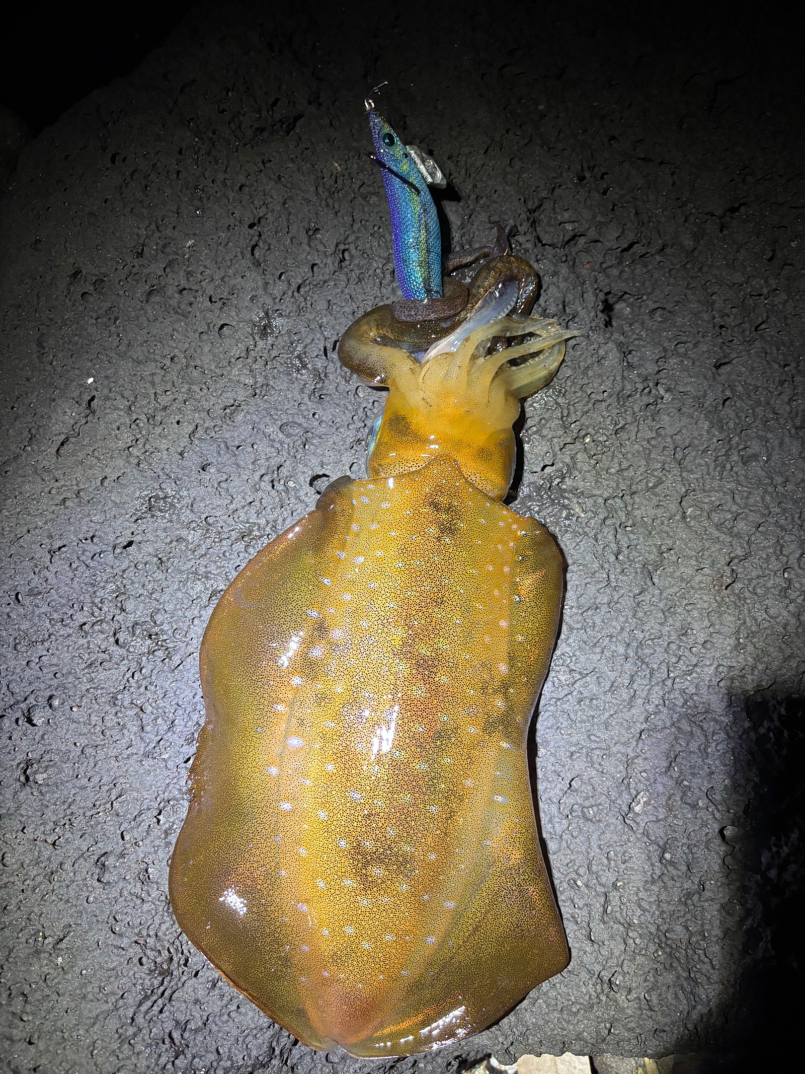 위 사진은 최근 9월 13일 토요일 제주시내권 나이트게임 출조하여 잡아올린 무늬오징어 1마리와 한치 1마리 입니다.